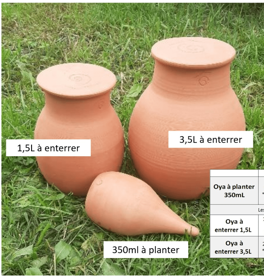 Les oyas, également appelées ollas, sont des poteries en terre cuite poreuse utilisées depuis plus de 4 000 ans comme système d’arrosage. Fabriquées à partir de matériaux naturels et recyclables, les oyas sont une solution écologique. Elles sont enterrées près des plantes, laissant leur col à l’air libre pour les remplir facilement. L’eau s’échappe par les parois poreuses de la poterie, humidifiant le sol en diffusant progressivement de l’eau directement (par capilarité) et permettent une irrigation ciblée, là où les racines en ont besoin, sans gaspillage. Les oyas représentent donc une méthode d’irrigation efficace et durable, favorisant une culture responsable tout en préservant les ressources en eau. Les oyas permettent ainsi d’économiser 30 à 70 % d’eau par rapport aux méthodes d’arrosage traditionnelles. L’arrosage régulier assure un apport constant d’humidité, réduisant le stress hydrique des plantes. En évitant l’humidité sur les feuilles, elles diminuent les risques de maladies comme le mildiou. L’arrosage souterrain limite la germination des herbes non désirées. C’est une solution idéale pour les légumes d’été (tomates, courgettes, poivrons).