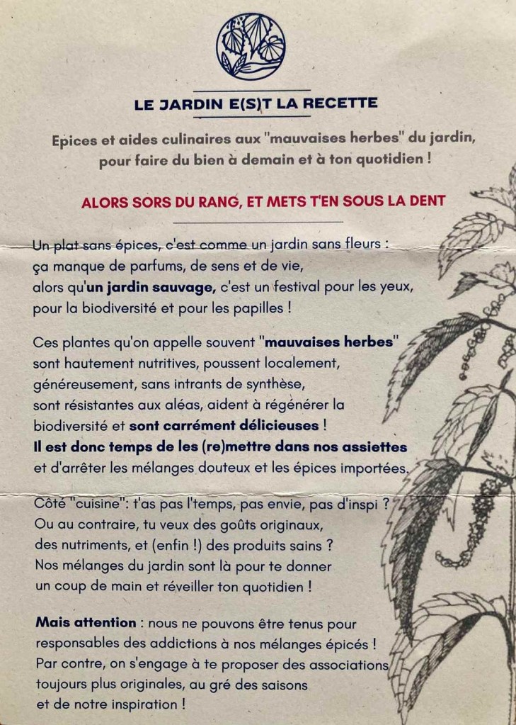 https://lejardinestlarecette.fr/ : Unique en son genre, ils vous proposent des épices et condiments issus de cueillettes sauvages ou producteurs français, de plantes courantes plus ou moins connues.